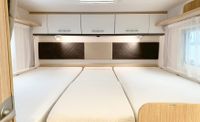 Autocaravana con dos camas gemelas traseras de 2´10 x 0´80, extensibles hasta tamaño “king size” de matrimonio de 2´10 x 2´40 y cama basculante de matrimonio sobre salón de 1´95 x 1´40 .